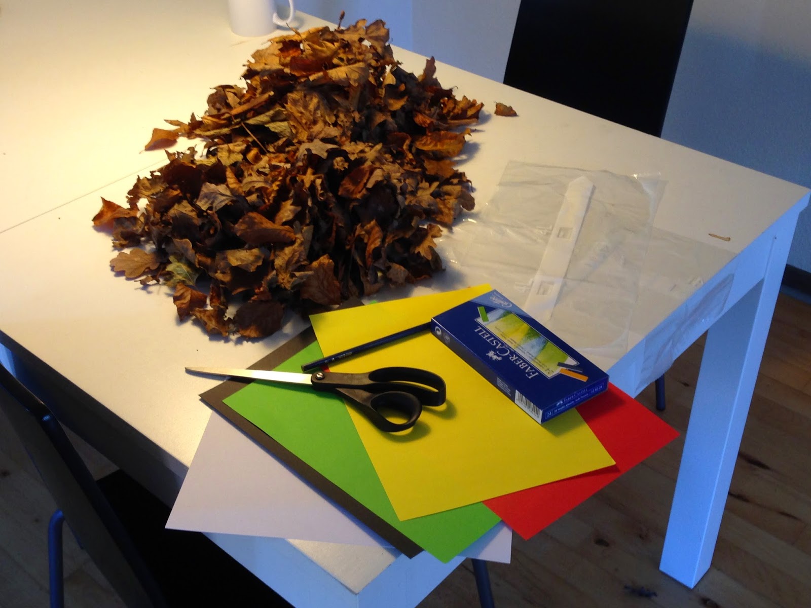 Da bladene var tørre fandt jeg materialer til min kreative og æstetiske proces, hvor jeg lavede efterårspynt ud af blade, plastic fryseposer og pap. Nedenfor ses mine materialer inden processen gik i gang: